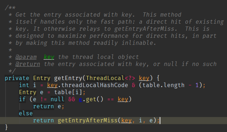1、首先从ThreadLocal的直接索引位置i获取Entry e,如果e不为null并且key相同则返回e。