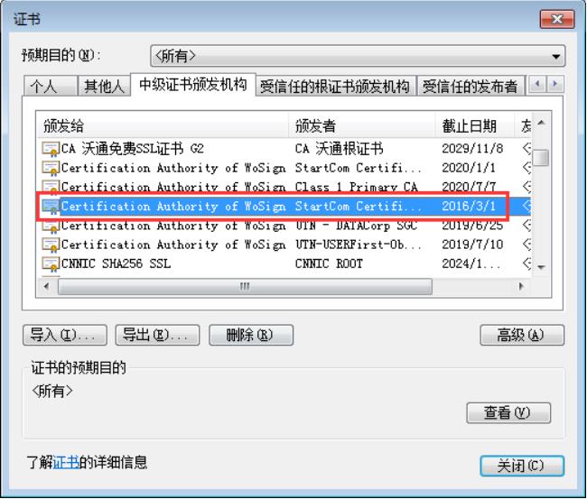第四:然后进入当前用户——中级证书颁发机构——证书,然后找到下图所示的证书,右键--属性--禁用掉此证书的所有目的——应用。(注意截至日期是2016年3月1日,颁发给是“CertificatetionAuthority of WoSign”颁发者是“StartComCertification Authority”)